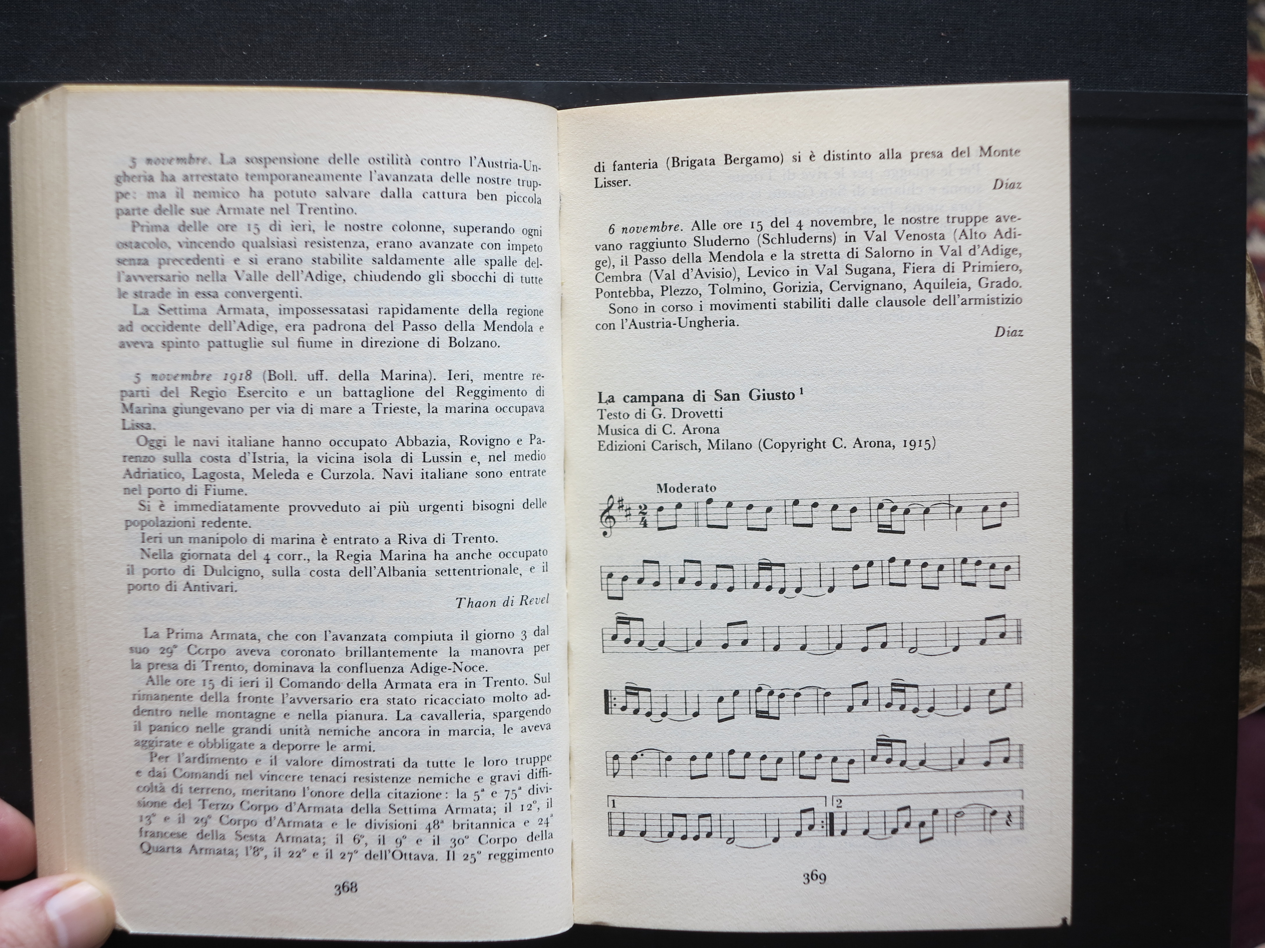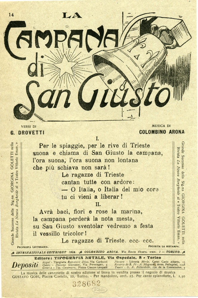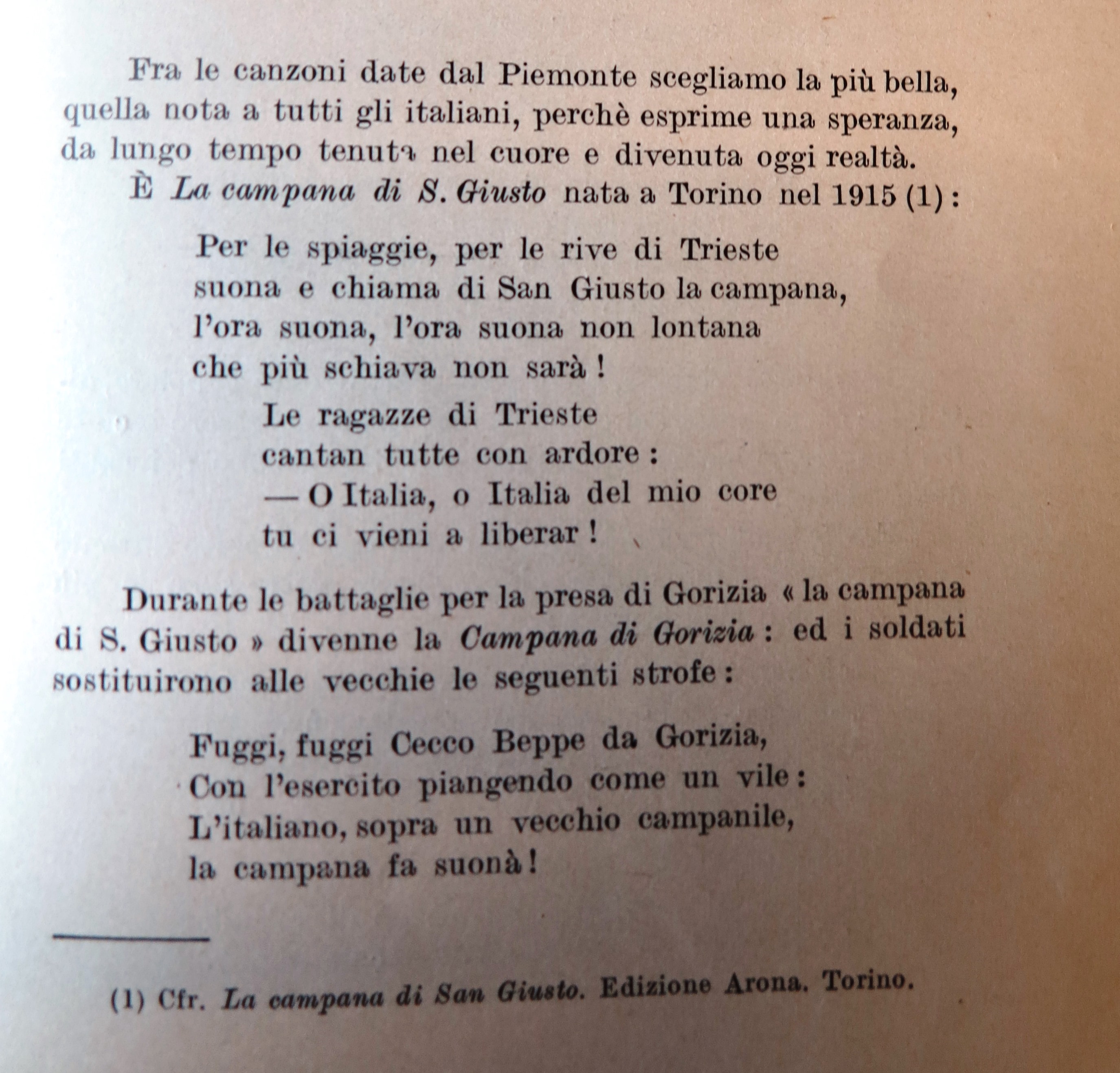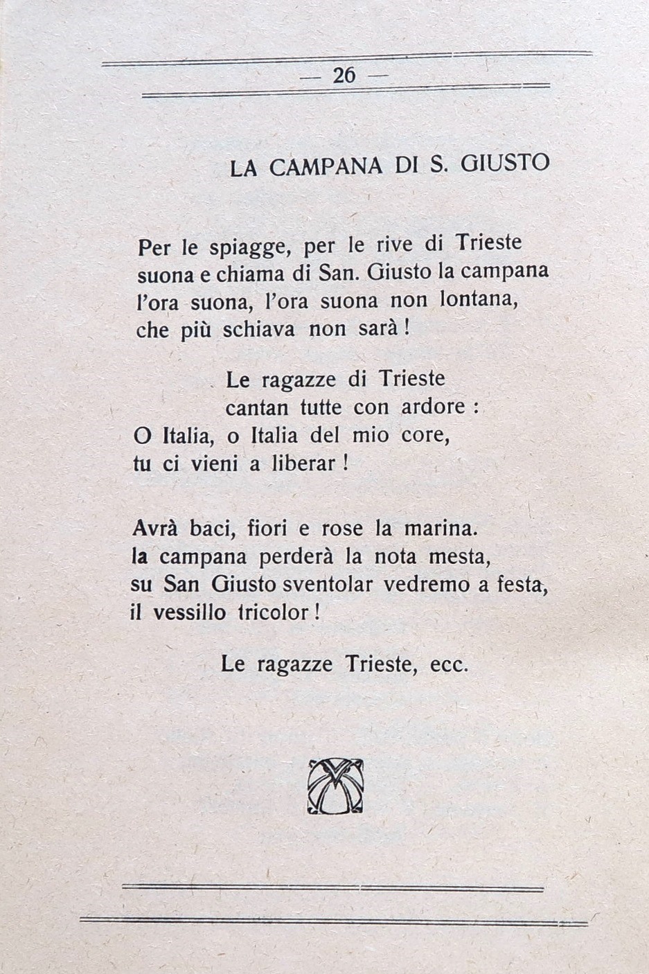 "La campana di San Giusto" è un brano musicale patriottico scritto nel 1915 da Giovanni Drovetti ((1879 – 1958) e musicato da Colombino Arona (1885 – 1949 ca.). Fu molto popolare durante la prima guerra mondiale. Il brano fa riferimento a una delle campane della cattedrale di San Giusto, che si trova sulla sommità dell'omonimo colle che domina Trieste. Questo edificio religioso fu particolarmente caro agli irredentisti italiani durante la prima guerra mondiale. L'Italia prese infatti parte a questo conflitto per completare l'unità nazionale con l'annessione del Trentino-Alto Adige e della Venezia Giulia. La campana di San Giusto, che venne composta nel 1915 a Torino, fu molto popolare durante la prima guerra mondiale e toccò il culmine della popolarità il 5 novembre 1918, ovvero due giorni dopo l'armistizio di Villa Giusti, con il quale l'Impero austroungarico si arrendeva all'Italia, consentendo alle truppe del Regio Esercito, nella data citata, di entrare vittoriose a Trento e a Trieste. La popolarità del canto si è espressa nel tempo attraverso interpretazioni vocali, corali e strumentali di cui forniamo ampia raccolta. Tra queste poniamo attenzione particolare all'esecuzione della Banda dell'Esercito Italiano (Italian Army Band) Fulvio Creux Direttore Milano, Teatro Alla Scala, 29 aprile 2005 (vds mp3 primo in elenco) che analizziamo meglio di seguito: LA CAMPANA DI SAN GIUSTO (elaborazione sinfonica di Fulvio Creux) In questa Elaborazione sinfonica della celebre canzone popolare (cantata per altro anche dai più noti nomi della lirica di ieri e di oggi), dopo un'introduzione lenta, nella quale il tema è proposto quasi come in una evocazione, inizia la parte brillante, eseguita dai vari strumenti sia all' "unisono" che "per terze", come avviene nei canti popolari. Al centro del brano abbiamo una "cadenza" dell'euphonium, durante la quale viene ricreato un effetto che vuole ricordare la bora: al termine della cadenza si prosegue con l'entrata di tutta la banda, in un clima di festa popolare che conclude con vivacità la composizione. "La canzoni della guerra e le loro varianti: Una storia della Grande Guerra attraverso le fonti orali è oggi, ovviamente, impossibile. E’ possibile, però, ricostruire i modi con cui il racconto della guerra è stato tramandato. Un particolare esempio di questa narrazione del primo conflitto mondiale è rappresentato dalle canzoni. Carmelo Campanella, un testimone particolarmente prezioso che ha già collaborato con l’Archivio degli Iblei, ha cantato per noi le canzoni che ha appreso dal padre, Giovanni Campanella. Le canzoni di Campanella differiscono anche significativamente dalla versioni note, interpretate sul palco dal Maestro Dario Adamo. Con il suo aiuto sono state analizzate anche rispetto alla loro origine, spesso popolare". (tratto da archiviodegliiblei.it) Alleghiamo in coda testo in duplice versione con relativa esecuzione canora di Carmelo Campanella e Dario Adamo.. Durante le battaglie per la presa di Gorizia, "La campana di San Giusto" divenne "La campana di Gorizia" (vds tale canto in archivio), con la sostituzione delle vecchie strofe sulla stessa linea musicale (vds ultimi due inserti prima degli mp3).